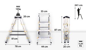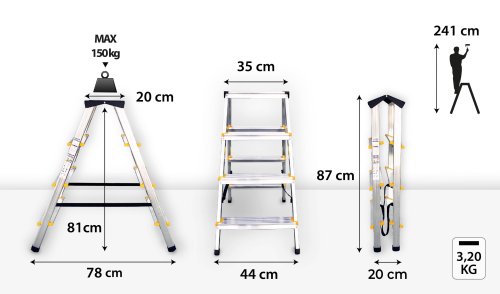 Výška schodíkov: 0,87 m Pracovná výška: 2,41 m Výška podesty: 0,81 m Šírka: 0,44 m Nosnosť: 150 kg Materiál: hliník/plast Hmotnosť: 3,2 kg EN 131 / EN 14183
