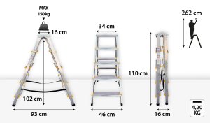 Výška schodíkov: 1,1 m Pracovná výška: 2,62 m Výška podesty: 1,02 m Šírka: 0,46 m Nosnosť: 150 kg Materiál: hliník/plast Hmotnosť: 4,2 kg EN 131 / EN 14183