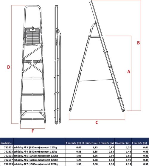 nosnosť: 120 kg počet nášľapov vr. plošiny: 5 rozmer plošiny: 250 x 250 mm výška plošiny: 1065 mm šírka schodíkov: 460 mm materiál: Al