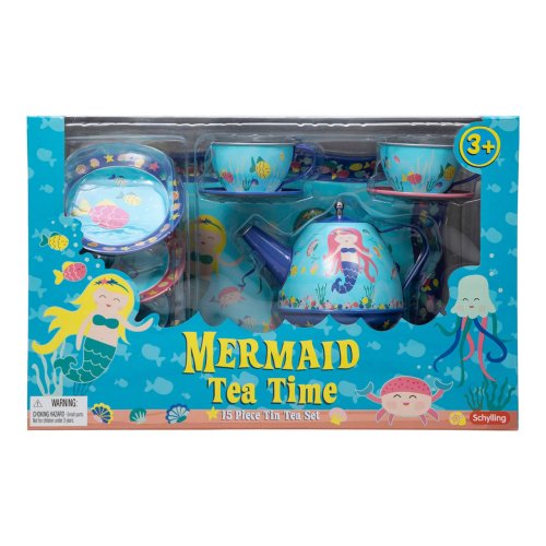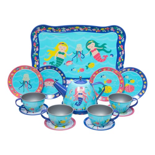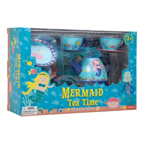 Je čas na čaj. Krásna 15 dielna čajová sada vyrobená z kovu, obsahuje 4 šálky s podšálkami, 4 dezertnými tanierikmi, kanvicu na čaj s pokrievkou a servírovaciu tácku, všetko v dizajne morských panien. Kreativita stúpa, keď Vaše ratolesti hostí kamarátov, bábiky a plyšové hračky s touto krásnou čajovou. Vhodné pre malých hostiteľov a hostiteľky vo veku od 3 rokov. Hlavné vlastnosti: 15dielna čajová sadaideálna pre predstierané čajové večierkydizajn s motívom morských panien