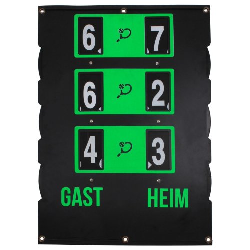 Vďaka obojstrannému ukazovateľovi skóre Merco Scoreboard DE budete spoľahlivo zaznamenávať priebeh každého tenisového duelu. Trojsetový ukazovateľ skóre s rozpätím bodov 0 – 7 má 9 cm veľké biele číslice na kontrastnom čiernom podklade a neónovo zelenom pozadí, aby bolo skóre dobre viditeľné pre hráčov aj pre divákov. Pohyb číslic zaisťujú manuálne posuvné kolesá po stranách ukazovateľa. Celkové rozmery ukazovateľa vyrobeného z odolného ABS plastu sú 83 x 58 cm a na svojom hornom aj dolnom pogumovanom okraji je doplnený otvormi na zavesenie. Vzhľadom na použitý materiál má Scoreboard nízku hmotnosť 3,4 kg. Tento model je vyrobený s nemeckými nápismi. - materiál: ABS plast, guma - rozmery: 83 x 58 cm - hmotnosť: 3,4 kg - jednoduché používanie - kovové oká na zavesenie - DE nápisy