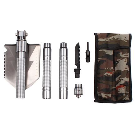 Scout multifunkčná lopatka uspokojí potreby všetkých užívateľov, ktorí radi trávia svoj voľný čas v prírode. Viacúčelová lopatka sa skvele hodí na kempovanie, skautské výpravy, alebo svoje využitie nájde na záhrade. Multifunkčná lopatka Scout je vyrobená z ocele, rukoväť má vrúbkovaný povrch pre lepšie uchopenie. Hlavu lopatky je možné použiť navyše ako pílku, otvárač fliaš a na presekávanie krovia. Lopatka je polohovateľná o 180 stupňov, to umožňuje jej využitie aj ako motyčku. Rukoväť je rozdelená na tri časti, ktoré jednoducho odskrutkujete. V rukoväti nájdete taktický nožík, píšťalku a kresadlo na rozloženie ohňa. Ukončenie rukoväte ponúka kovový hrot na núdzové rozbíjanie skla. Celá multifunkčná lopatka je zložená v praktickom obale s maskáčovým vzorom. Výrobok je vhodný pre osoby staršie ako 18 rokov alebo na použitie pod dohľadom dospelej, zodpovednej osoby. Šírka hlavy lopatky: 12,5 cm Dĺžka hlavy lopatky: 16 cm Celková dĺžka lopatky: 78 cm Hmotnosť lopatky s obalom: 1,2 kg