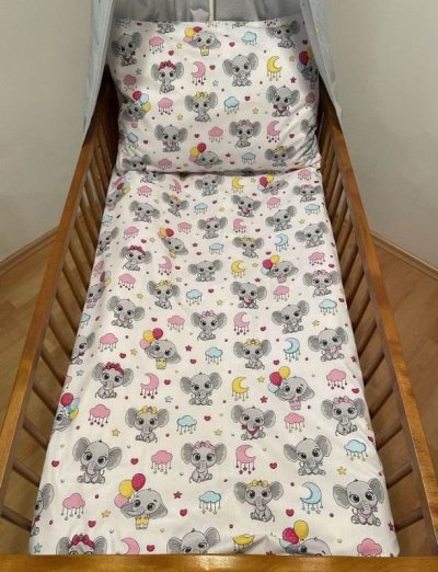 SDS Obliečky do postieľky Veselí sloníci 90/130, 45/60 Detské obliečky do postieľky, vyrobené zo 100% Bavlny, zapínanie na zips, pred prvým použitím odporúčame vyprať na 40 ° C, ušité v SR, možno objednať aj iný rozmer, dodacia doba cca 14 dní Materiál: 100% Bavlna Rozmer: 1x 90/130, 1x 45/60 cm