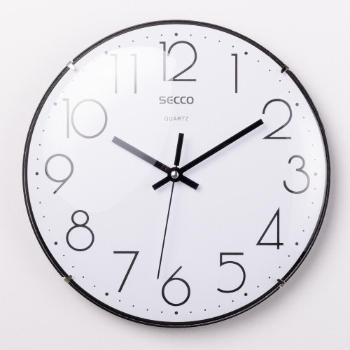 Nástenné hodiny Napájanie z batérie Rozmery 300 MM Puzdro v tvare kruhu Plastové puzdro Biela farba púzdra Ručičkový ciferník Biela farba ciferníka Ciferník s arabskými číslami