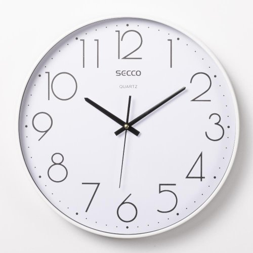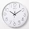 Nástenné hodiny Napájanie z batérie Rozmery 250 MM Puzdro v tvare kruhu Plastové puzdro Biela farba púzdra Ručičkový ciferník Biela farba ciferníka Ciferník s arabskými číslami