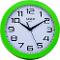 Nástenné hodiny Napájanie z batérie Rozmery 250 MM Puzdro v tvare kruhu Plastové puzdro Zelená farba puzdra Ručičkový ciferník Biela farba ciferníka Ciferník s arabskými číslami