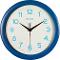 Nástenné hodiny Napájanie z batérie Rozmery 280 MM Puzdro v tvare kruhu Plastové puzdro Modrá farba puzdra Ručičkový ciferník Biela farba ciferníka Ciferník s arabskými číslami