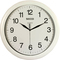 Nástenné hodiny Napájanie z batérie Rozmery 320 MM Puzdro v tvare kruhu Plastové puzdro Biela farba púzdra Ručičkový ciferník Biela farba ciferníka Ciferník s arabskými číslami