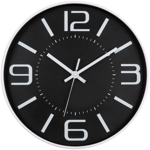 Nástenné hodiny Napájanie z batérie Rozmery 290 MM Puzdro v tvare kruhu Plastové puzdro Biela farba puzdra Ručičkový ciferník Čierna farba ciferníka Ciferník s arabskými číslami