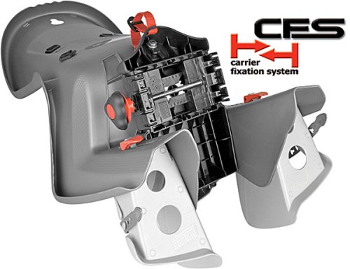 - Upevnenie detskej sedačky bez náradia, spodná časť sedačky sa pevne pripája k nosiču pomocou kolieska, sedačka je pozdĺžne posuvná