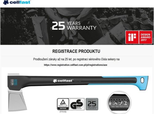 Na všetky produkty značky Cellfast sa vzťahuje zo zákona 2 ročná záruka. V prípade sekier Cellfast je možné si záruku predĺžiť a to až na dobu 25 rokov, na základe registrácie na stránkach: https://www.registration.cellfast.com.pl/pl/registrations/axe Je potrebné, aby registráciu sekery realizoval konečný zákazník ihneď po kúpe tovaru. Každá sekera má svoj špecifický identifikačný 16-miestny registračný kód, ktorý je umiestnený na sekere a to hneď pod symbolmi.