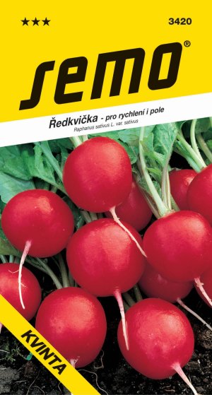KVINTA - "celoročná" skorá až poloskorá odroda reďkovky pre skoré poľné pestovanie aj pre jesenné výsevy od 15. augusta. Väčšia guľatá buľvičky sa svietivo červenou farbou a jemnou šupkou ju robí veľmi atraktívne. Dužina je biela, jemná, veľmi odolná k houbovatění. List je polovzpriamený, mohutnejšie, svetlo zelenej farby. Je veľmi odolná k praskaniu a vybiehaniu do kvetu. Pre jesenné siatie doporučujeme riadky 10 - 12 cm, 300 - 350 semien / m2.