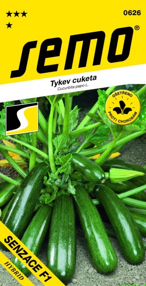 SENZÁCIA F1 SM (kód 0626) - veľmi výnosná cuketa s kratšími valcovitými, tupo zakončenými plody stredne zelenej farby s jemne sieťovanou šupkou s dĺžkou