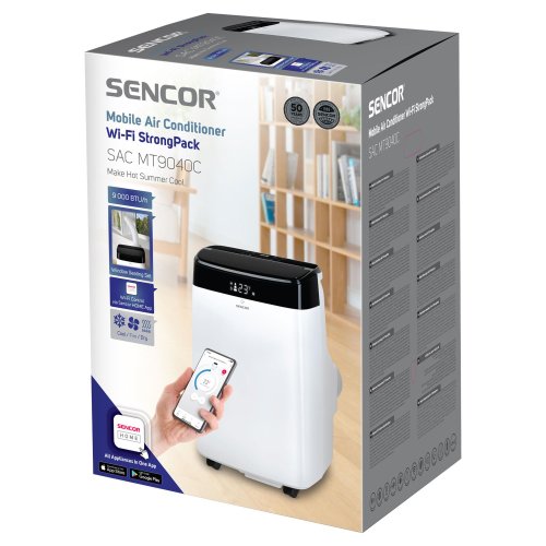 Mobilná klimatizácia Sencor SAC MT9040C Wi-Fi StrongPack, to je efektívny výkon premyslene poskladaný do kompaktného a pritom vydesignovaného balenia. triedy A vám umožní ľahko a účinne vychladiť vašu kanceláriu, izbu alebo napríklad spálňu.