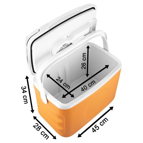 Autochladnička Vnútorný objem 22 l (21 l po zatvorení veka) Chladí až o 20 ° C pod okolitú teplotu Vonkajšie rozmery 460 x 440 x 292 Vnútorné rozmery 395 x 245 x 350 (-45) mm Napájanie DC 12 V z automobilovej