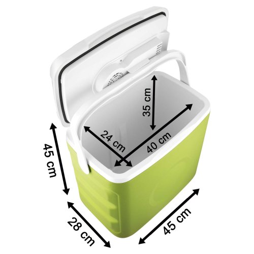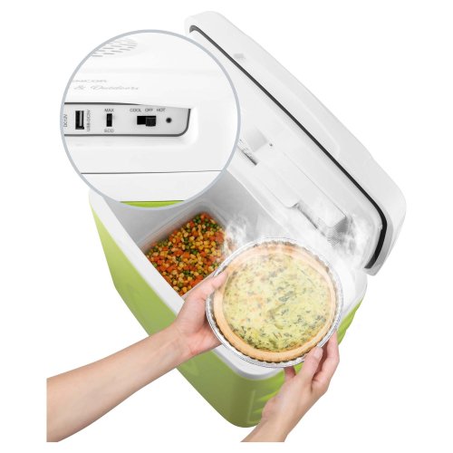 Vlastnosti Vnútorný objem: 30 l Využiteľný objem: 29 l Vrátane 3 chladiacich vložiek Zvládnem chladenie, ale ponúkam aj funkciu ohrevu Štýlový dizajn, ideálny pre použitie doma aj v prírode Veľká rukoväť pre ľahké prenášanie na piknik a kempovanie Som tichá. Maximálna hladina hluku: 42 dB(A) 3 možnosti napájania AC 220-240 V DC 12 V - 12 V automobilová zástrčka napájania cez 5V USB - napríklad z powerbanky Príkon: 55 W / 45 W / 10 W Len 10 W v teplote ECO Maximálny chladiaci výkon 18 ohrevu až 50-60 °C Izolácia: Cyklopentan Vonkajšie rozmery (š × v × h): 460 × 440 × 292 mm Vnútorné rozmery (š xvxh): 395 x 245 x 350 (-45) mm Hmotnosť: 5,1 kg