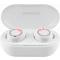 Plne bezdrôtové bluetooth slúchadlá typu True Wireless Stereo – TWS, BT 5.0 Priemer meničov: 10 mm Impedancia: 32 Ω +/-10% Frekvenčná odozva: 20 – 20 000 Hz Citlivosť: 100 +/- 3 dB (@ 1 : -42 dB±3dB BT: v5.0 Max. vzdialenosť pripojenia: 10 m Max. doba potrebná na nabitie: ≤ 2 h Max. doba prehrávania: až 7 h Typ a kapacita batérie: 3,7 V 50 mAh Li-ion (každé slúchadlo) a 3,7 V 400 mAh Li-Ion (nabíjacia a dokovacia stanica) Napájanie: cez Micro Usb Kábel Váha: 41 g Farba: biela Max. vyžarovací výkon: 2.5mW / 2.4GHz – 2.485GHz Príslušenstvo: nabíjací kábel, 3 veľkosti silikónových nástavcov