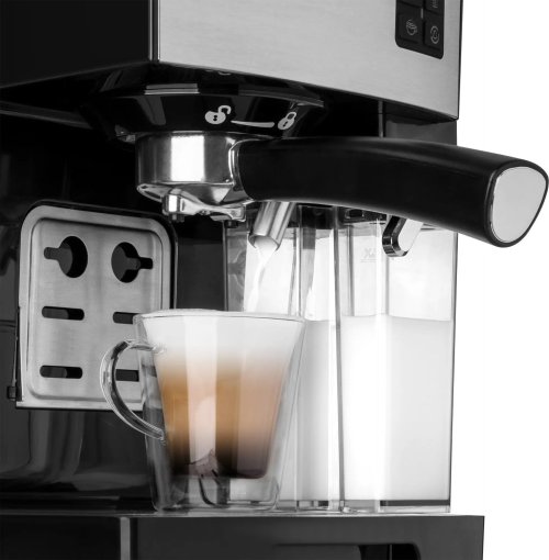 Tlak čerpadla 20 barov pre vynikajúcu kávu Bojler s vykurovacím systémom Thermoblock Veľmi rýchly predohrev Systém predsparenia pre plnšiu chuť kávy Spustenie programu Espresso, Double Espresso, Cappuccino, Latté a Napenené mlieko jedným dotykom Priehľadná nádobka na mlieko alebo 2 šálky kávy Vyhrievaná doska na predohrev šálok Funkcia pamäte veľkosti šálky kávy Elektronická riadiaca jednotka so senzorom pre presnejšiu teplotu nápoja Kryt z nerezovej ocele na malé šálky pre Espresso Automatická samočistiaca funkcia Odnímateľná odkvapkávacia miska pre ľahké čistenie Extra miesto pre veľké čistenie čerstvú vodu pre vašu lahodnú kávu Indikátor hladiny vody Indikátor požiadavky na odvápnenie Program na odvápnenie Vypínač so svetelnou kontrolkou Protišmykové nôžky