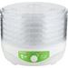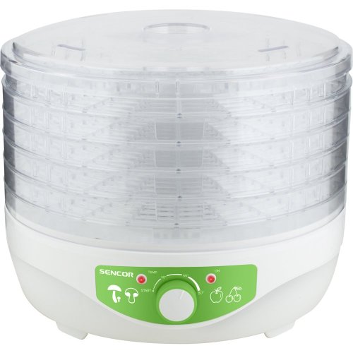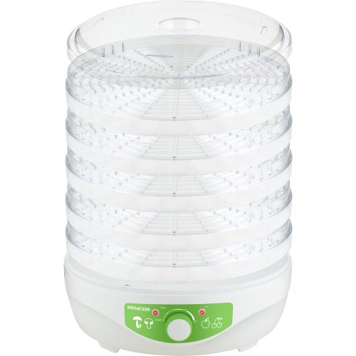 sušených rýb Regulácia teploty 35-80 °C 5 sušiacich sít v základnej výbave Úspora miesta pri prevádzke s menším počtom sít (možno už s jedným sitom) Priemer sušiaceho sita: 23 cm Úžitková výška poschodia: 1,3 cm Integrovaný ventilátor napomáha rovnomernému sušeniu na všetkých poschodiach Dizajn mriežky sušiacich sít zabraňuje vzniku plesní a optimalizuje prúdenie vzduchu Priehľadné veko a sitá umožňujú okamžitú vizuálnu kontrolu nad stavom sušenia Sušiace sitá i veko je možné umývať v umývačke riadu Tepelná poistka proti prehriatiu Príkon: 250 W Dĺžka prívodného kábla: 0,9 m Rozmery (šírka × hĺbka × výška): 230 × 230 × 190/230 mm Hmotnosť: 1,3 kg Napätie a kmitočet: 220-240 V, 50 Hz