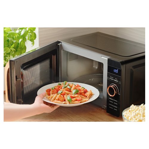 Ovládací otočný gombík ponúkne 5 intenzít mikrovlnného ohrevu. Ovládací gombík a madlo sú obohatené o luxusné prvky SlimCopper a ovládací panel je príjemne LED podsvietený, čo funguje súčasne aj ako indikátor prevádzky. Na ovládanie uvidíte prehľadne zvolený stupeň ohrevu a navolenú funkciu.