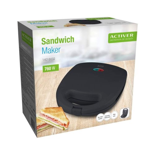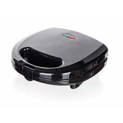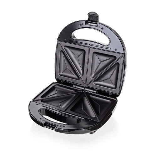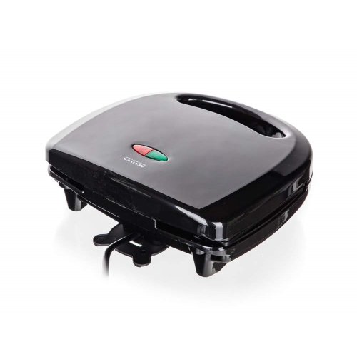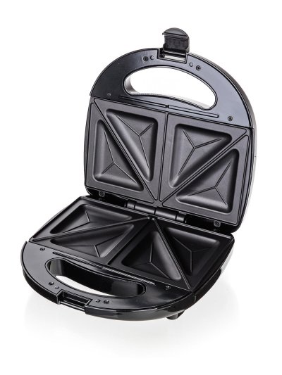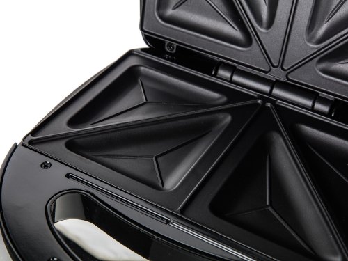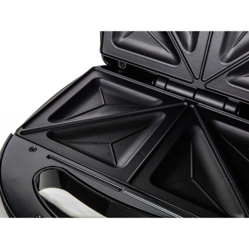 Sendvičovač s príkonom 760 W, v čiernej farbe, má nepriľnavý povrch, ktorý sa ľahko čistí. Obsahuje 4 trojuholníkové diely a zámok dosiek pre ľahšiu manipuláciu. Je opatrený tepelne izolovaným madlom, má kontrolku prevádzky / pripravenosti a protišmykové nožičky.
