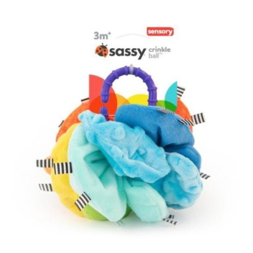 Mäkká, pestrofarebná loptička plná rôznorodých materiálov, ktoré navyše šuštia.