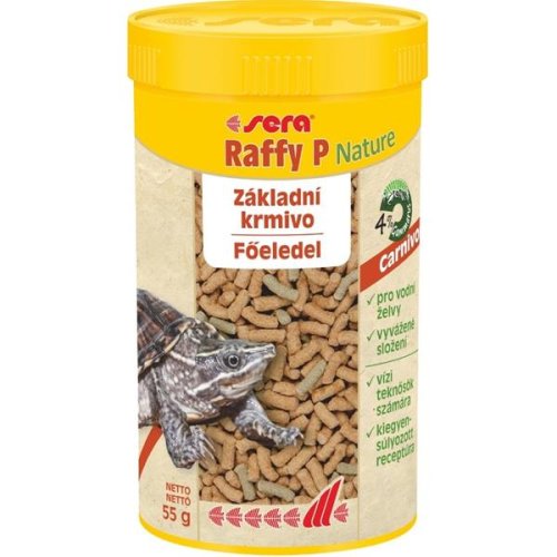 Sera Raffy P Nature sú chutné plávajúce kŕmne tyčinky na denné kŕmenie vodných korytnačiek obsahujú zmes vodných a rastlinných zložiek. Preto sú ideálne aj pre staršie vodné korytnačky, ktoré dávajú vo svojej výžive prednosť rastlinným zložkám. Návod na použitie: Kŕmiť úsporne. Podľa potrieb zvierat doplniť čerstvým krmivom. Zloženie: kukuričný škrob, pšeničný lepok, rybia múčka, pšeničná múka, pivné kvasnice, vaječný prášok, rybí tuk, gamarusi, slávka zelenoústa, lucerna, byliny, žihľavy, petržlen, morské riasy, paprika, spirulina, špená. Analytické zložky: bielkoviny 41,0%, tuky 5,4%, vláknina 4,5%, vlhkosť 4,0%, popol 5,4%, Ca 1,0%, P 0,6%. Doplnkové látky: Vitamíny a provitamíny: vit. A 30.000 IU/kg, vit. D 3 1.500 IU/kg, vit. E (D, L-α-tocoferyl acetát) 60 mg/kg, vit. B 1 30 mg/kg, vit. B 2 90 mg/kg, stab. vit. C (L-ascorbyl monofosfát) 550 mg/kg. Farbivá schválená EÚ.