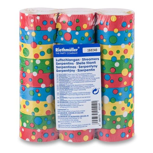 Papierové stuhy s bodkami v rolke. Jedna rolka obsahuje 9 pruhov 14 mm x 4 m. Mix farieb a veľkostí bodiek. Balenie 3 rolky.