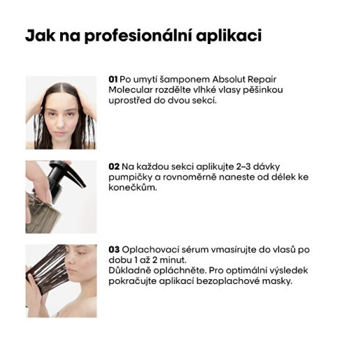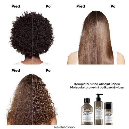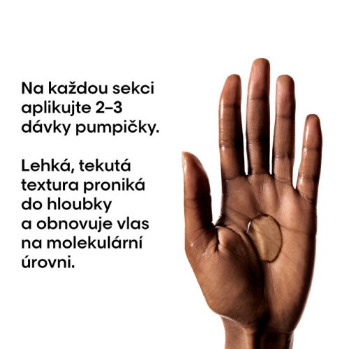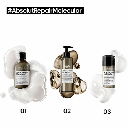 Pokiaľ je vlas poškodený, jeho molekulárna štruktúra skladajúca sa z peptidov, je oslabená. Ale väčšina peptidov je príliš veľká na to, aby išla vrátiť dovnútra vlákna, takže poškodenie je takmer nevratné. Vedecký objav - Absolut Repair Molecular. Schopné zregenerovať značne poškodené vlasy jediným použitím.* Vôbec prvýkrát sa vedcom z laboratórií L'Oréal Advanced Research podarilo peptidy rozložiť a vložiť ich jednotlivé časti do vlasového vlákna. Akonáhle sa tieto časti dostanú dovnútra, môžu znovu vytvoriť a obnoviť molekulárnu štruktúru vlasu. Exkluzívne koncentrované sérum obsahuje Peptides bonder a 5 aminokyselín pre obnovu molekulárnej štruktúry vlasov, navracia vlasom silu, pružnosť a prirodzený pohyb.*** Je inšpirované účinnými sérmi pre starostlivosť o pleť. Ďaleko presahuje účinky obnovujúcich vlasových masiek, preniká do hĺbky vlasového vlákna, kde účinne obnovuje molekulárnu štruktúru vlasov. Nezanecháva nános na povrchu vlasu. Okamžitá a viditeľná premena vlasov: vlasy sú oveľa lesklejšie a hebkejšie. Textúra pripomínajúca sérum sa okamžite vstrebáva do vlasového vlákna, kde obnovuje molekulárnu štruktúru vlasu*** bez zaťaženia. Pre všetky textúry vlasov, pre farbené, zosvetlené aj prírodné vlasy.*Inštrumentálny test na molekulárnej štruktúre vlasového vlákna po aplikácii šampónu, séra a bezoplachovej masky z radu Absolut Repair Molecular. **Inštrumentálny test po 15 aplikáciách šampónu, séra a bezoplachovej masky z radu Absolut Repair Molecular. ***Spotrebiteľský test po 2 týždňoch používania šampónu, séra a bezoplachovej masky.****Inštrumentálny test na molekulárnej štruktúre vlasového vlákna po aplikácii prípravnej starostlivosti, šampónu, séra a bezoplachovej masky z radu Absolut Repair Molecular.