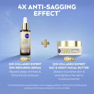 Doprajte svojej pleti kvalitnú starostlivosť. Sérum proti vráskam Q10 Collagen Expert je vaša nová superstar pre prirodzene mladistvý vzhľad pleti a podporu jej optimálneho fungovania. Táto 3v1 regeneračná starostlivosť spevňuje kontúry tváre, posilňuje ochrannú bariéru pleti a redukuje aj hlboké vrásky.