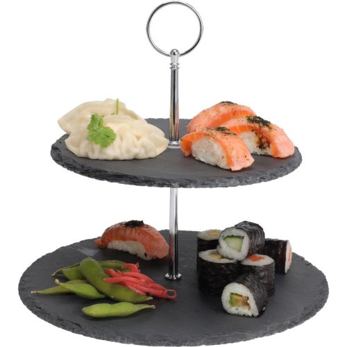 Štýlový a praktický dvojposchodový stojan z prírodnej bridlice, ideálny na servírovanie rôznych druhov pochutín a dezertov.