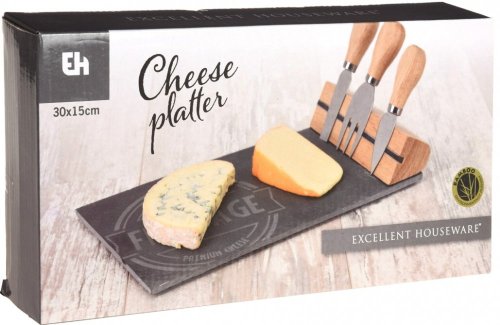 sada na podávanie syrov s tromi noži- servírovacia bridlicová doska s dizajnovou potlačou- drevený magnetický držiak na nože na syr- čepele nožov z nerezovej ocele- sada obsahuje servírovaciu dosku a 3 rôzne druhy nožov na syry- rozmery dosky : 5 - farba: šedá / prírodné drevo / nerez