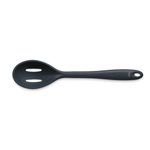 Silikónová servírovacia lyžička Tom od kela - 28 cm dlhá a preto ideálna pre pohodlné a bezpečné zdvíhanie alebo servírovanie riadu. Kvalitný kuchynský pomocník je vybavený šikovným, skôr plochým uchom a praktickým pútkom na zavesenie, takže ho je možné po použití buď zavesiť, alebo uložiť do zásuvky. Silikónová lyžička má 3 väčšie otvory, ktoré umožňujú ľahký odtok tekutín pri podávaní. Vyrobené zo silikónu, čierna. Silikónová čierna, 28x6cm