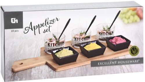 • servírovací set misiek a pohárov na tácke pre najrôznejšie príležitosti - materiál: kamenina s matnou glazúrou / drevo - podnos z bambusového dreva s pripravenými otvormi pre misky, mištičky vďaka tomu drží na mieste - perfektný pre servírovanie sushi, predjedál, pochutín, dipov a omáčok - žiaruvzdorné do 200 ° C, misky možno využiť aj na zapekanie - vhodné do umývačky riadu - sada obsahuje bambusový podnos, 3 misky, 3 poháre a 3 lyžičky - rozmery tácky: 37 x 17 x 0,6 cm - farba: čierna / transparentná / drevo- značka: Excellent Houseware