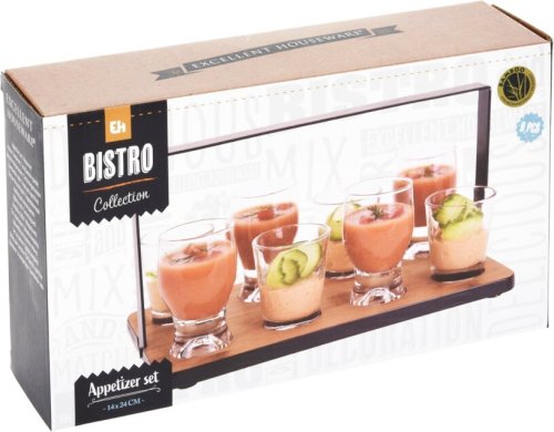 Servírovací podnos + sada 8 ks pohárov- ideálny pre prípravu predjedál, dezertov a pochutín- podnos vyrobený z kovu a dreva- dva druhy pohárov, celkom 8 pohárov v balení- rozmery: 14 x 24 x 14 cm- značka: Excellent Houseware