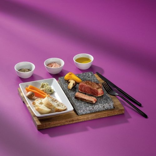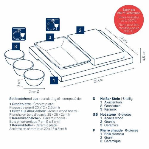 Sada skladajúca sa zo žulového taniera 20x12x2, 5cm hs doskou z akáciového dreva 29 x 23 x 2cm h vrátane 3 bielych keramických misiek 7x3cm h 1 biely keramický tanier 20x13x3cm h