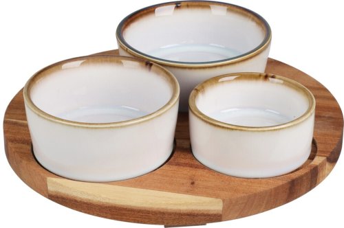 • servírovací set misiek na okrúhlom podnose pre najrôznejšie príležitosti - ideálne použijete pri servírovaní predjedál, dipov a pochutín - materiál: keramika s lesklou glazúrou, agátové drevo - štýlový podnos z agátového dreva - agátové drevo je robustný a má krásnu textúru - žiaruvzdorné do 2 , misky možno využiť aj na zapekanie - misky sú vhodné do umývačky riadu - sada obsahuje servírovaciu tácku a 3 misky - rozmery podnosu: 20 x 1,2 cm - rozmery misiek: 10 x 4 cm / 9 x 3,5 cm / 7 x 3,4 cm- farba: biela / drevo- značka: Excellent Houseware
