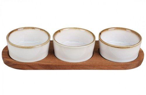 • servírovací set misiek na podnose pre najrôznejšie príležitosti - ideálne použijete pri servírovaní predjedál, dipov a pochutín - materiál: keramika s lesklou glazúrou, agátové drevo - štýlový podnos z agátového dreva - agátové drevo je robustný a má krásnu textúru - žiaruvzdorné do 200 ° C misky možno využiť aj na zapekanie - misky sú vhodné do umývačky riadu - sada obsahuje servírovaciu tácku a 3 misky - rozmery podnosu: 29 x 10 x 1,2 cm - rozmery misky: 8,5 x 4 cm - farba: biela / drevo - značka: Excellent Houseware