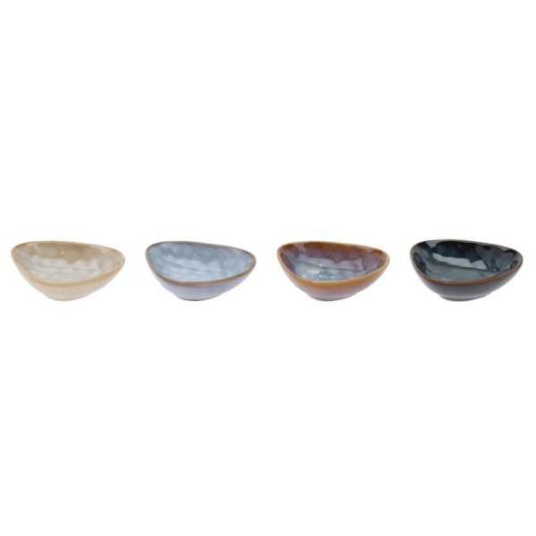 Moderná a farebná sada kameninových misiek, ideálna na servírovanie snackov, pochutín alebo dipov. Každá miska je jedinečná vďaka reaktívnej glazúre v trendy farbách.