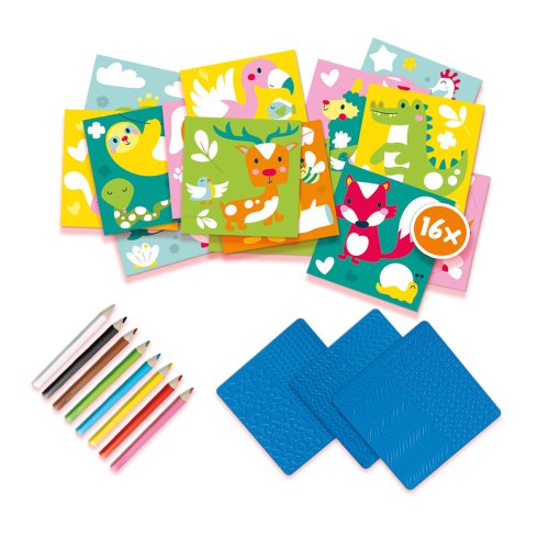 Táto umelecká sada SES obsahuje 16 farebných listov, ktoré je možné vyfarbiť pomocou zábavných plastových doštičiek s vyvýšenými vzormi. Na jednu z troch doštičiek položte farebný papier a jemnými ťahmi pretrite pastelkou. Aké vzory vidíte? Sada obsahuje: 16 farebných listov, 3 plastové podložky s rôznou štruktúrou, 8 farebných pasteliek. Rozmer balenia: 20 x 20 x 4 cm. Vek: 3+