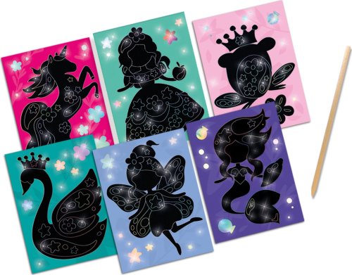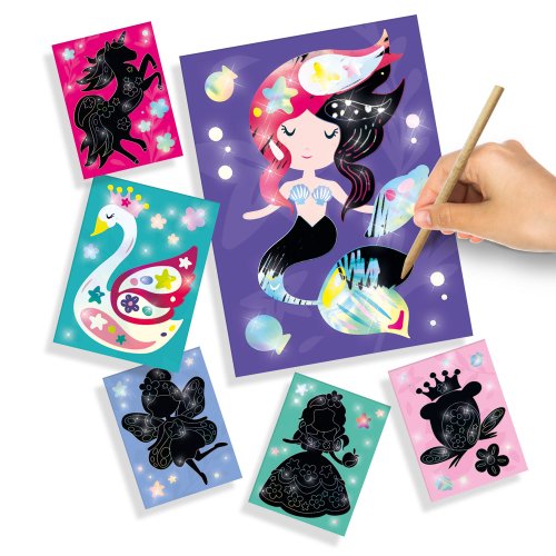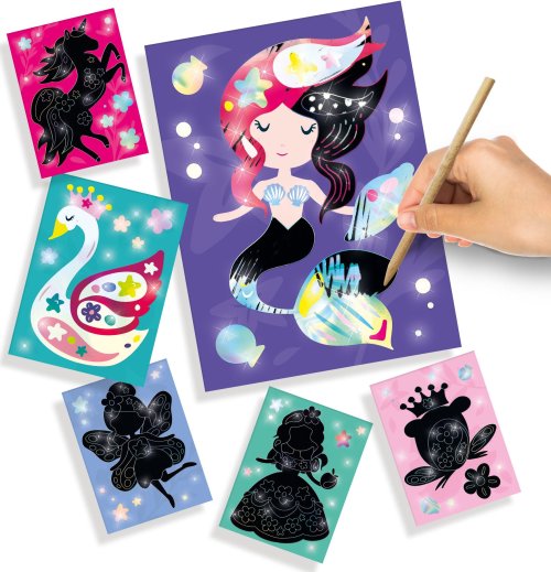 Zábava s farebným koncom! Škrabacie obrázky Ses sú výborným darčekom nielen pre kreatívne deti. Papier je potiahnutý čiernou vrstvou skrývajúcou podklad s holografickým efektom, ktorý z kresby urobí nevšedný pohľad. Postup: Rozprávkové postavičky ukryté pod tmavou stieracou vrstvou majú holografický farebný efekt. Pomocou dreveného vyškrabávacieho pera nakreslite svoje vlastné krásne vzory a nechajte ich ešte viac žiariť! Jednoducho vyškriabte predkreslené časti škrabacím perom a vytvorte obrázok. Fantázii sa medze nekladú, preto je možné vyškriabať aj čierne miesta bez potlače a dodať obrázku osobitý rámček. Obsah balenia: 6 holografických vyškrabávacích kariet, 1 drevené vyškrabávacie pero.