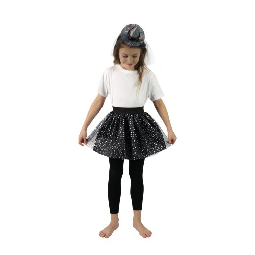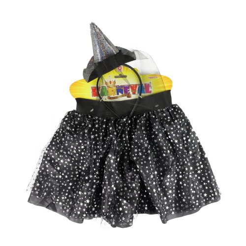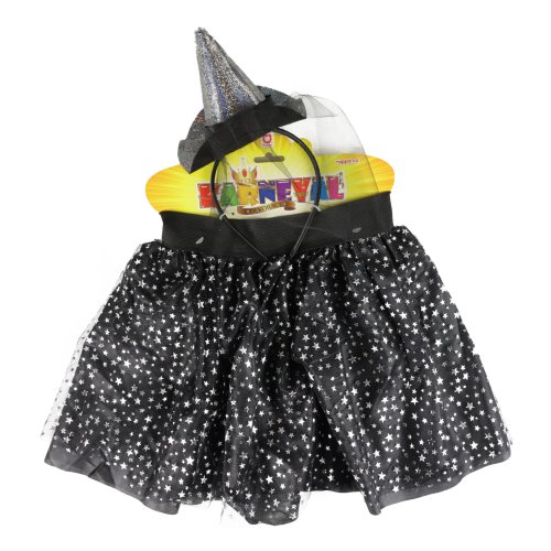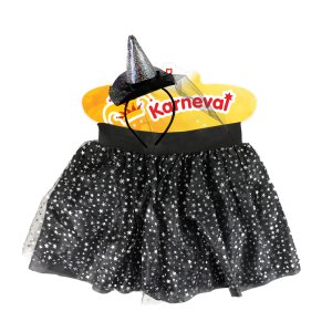 Bezva sada pre všetky malé parádnice čarodejnice! Sukienka má čiernu spodničku, prekrytú tylom s potlačou strieborných hviezdičiek. Je určená pre dievčatká vo vekovom rozmedzí 3-7 rokov. Dĺžka sukne je 28 cm. Set je doplnený o čelenku s klobúčikom, ktorý perfektne ladí k sukienke. Skvele sa hodí aj na oslavu Halloweenu alebo karneval!