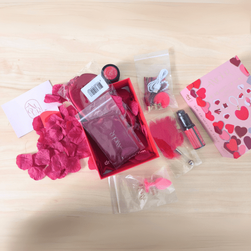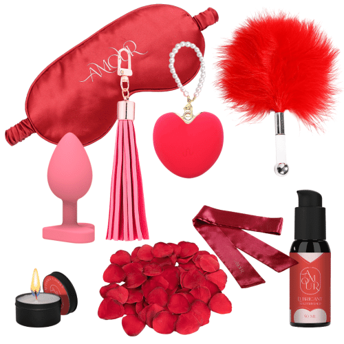 Obsah: posyp na posteľ s okvetnými lístkami, maska na oči, saténová stuha, masážna sviečka, mini bičík, simrátko, silikónový vibrátor v tvare srdca, nevibračný análny kolík s priemerom 2,9 cm s lubrikačným gélom.
