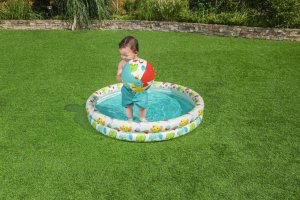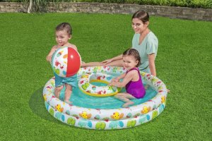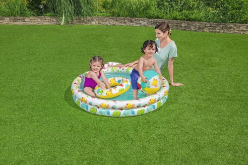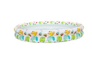 Súčasťou setu je aj nafukovací kruh, ktorý je určený pre deti vo veku 3 až 6 rokov. Kruh má rozmery 46 × 46 × 11 cm a je vyrobený z rovnakého materiálu ako bazénik. Je zdobený rovnakými farebnými motívmi, vďaka čomu ladí s celým setom. Tento kruh slúži nielen ako zábava, ale aj ako pomôcka pre bezpečnejší pobyt detí vo vode. Ďalšou súčasťou balenia je nafukovacia lopta s priemerom 27 cm, ktorá je farebná a lemovaná rovnakými motívmi ako bazénik a kruh, čo umožňuje deťom interaktívnu hru vo vode.