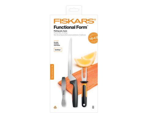 Vynikajúca vidlica 1057547 Vám pomôže pri porciovaní a pečení rôznych druhov rýb. Možno ju tiež využiť pri grilovaní alebo servírovaní na ľahké pridržanie a uchopenie ryby. Veľký nôž 1057540 s tenkou pružnou 22 cm čepeľou je ideálnym pomocníkom nielen pri filetovaní rýb, ale aj krájaní veľkých kusov šunky, roastbeefu, salám a iných potravín, ktoré vyžadujú jemné a precízne plátkovanie. Čepeľ noža je prefektne ostrá a práca s filetovacím nožom Functional Form je teda veľmi jednoduchá a efektívna. S jeho pomocou bude príprava rýb do japonských pokrmov hračkou. Pinzeta 1003023 z nerezovej ocele vhodná na jednoduché odstraňovanie rybích kostí. Široké čeľuste zaistia stabilné uchopenie každej kostičky. Hmotnosť: 0,238 kg.