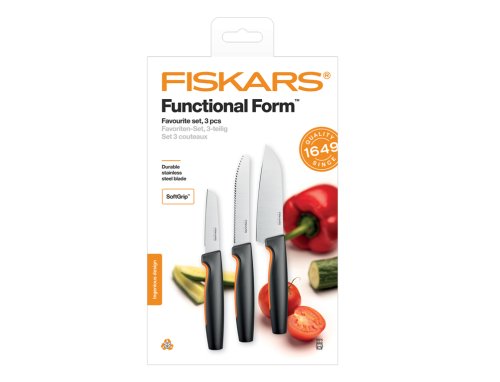 Štartovacia sada nožov Fiskars Functional Form 1057556 obsahuje nôž okrajovací, raňajkový a malý kuchársky nôž.