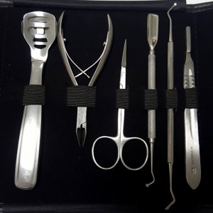 Luxusný 10 nástrojový profesionálny set pre pedikérky obsahujúce kliešte (3 ks), exkavátor (2 ks), nožnice, držadlo skalpelových čepieľok, celokovový hoblík Credo, čepelky č. 21 (10 ks) a čepieľky do hoblíka (10 ks). Set je v kvalitnom pevnom koženkovom balení. Precízne spracovanie všetkých nástrojov zaistí spokojnosť pri používaní.