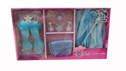 Každé dievčatko by chcelo byť princeznou. Bav sa s týmto princeznovským setom a ukáž aká si princezná. Sada obsahuje sukienku, papučky, korunku, kabelku, prútik a šperky v modrej farbe.