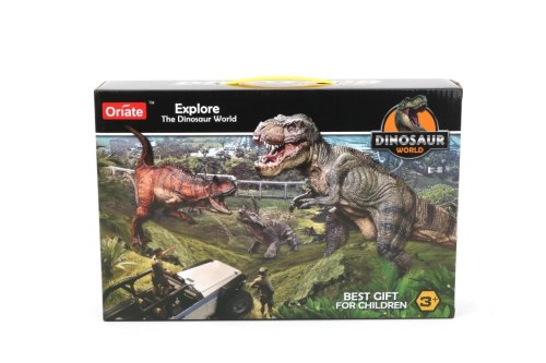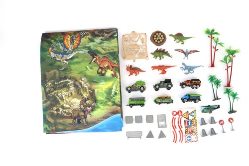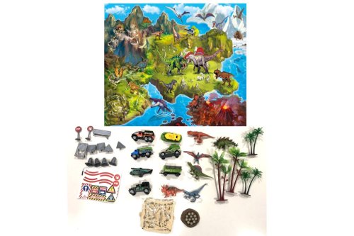 Hrací set s figúrkami dinosaurov, autíčkami a ďalšími hracími prvkami.