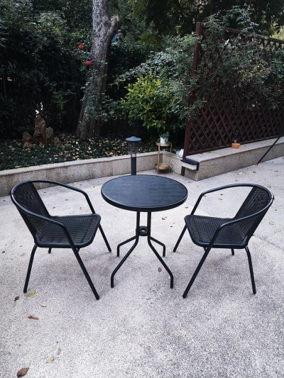 Set záhradného nábytku skladajúci sa z dvoch stoličiek a stola je vhodný na posedenie na záhrade.